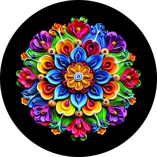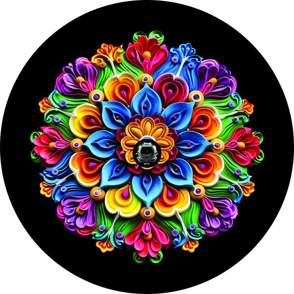 Vibrant Colorful Mandala Tire Cover on Black Vinyl