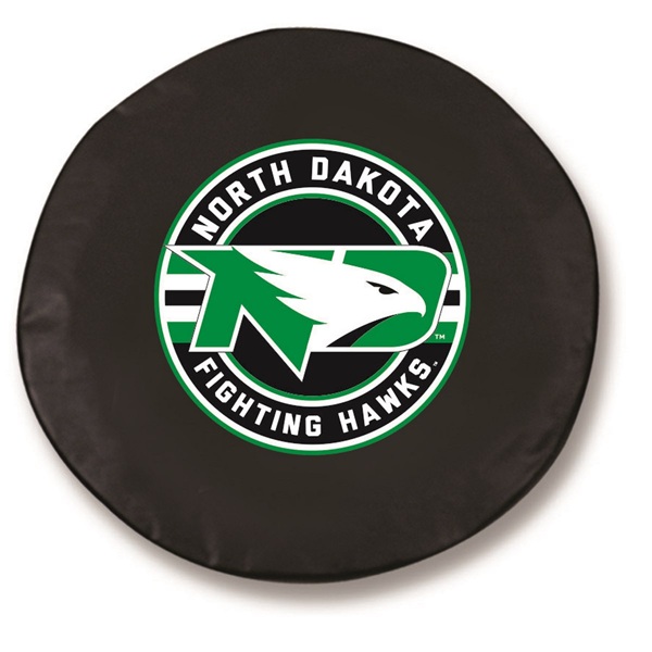 Our North Dakota Fighting Hawks spare tire cover is hand-made in the USA by Holland Bar Stool Company. A state of the art printing process utilizing UV resistant inks ensures that the Fighting Hawks logo is more detailed and durable to withstand direct sun light and look great year after year. The commercial grade, marine vinyl holds up in even the harshest weather conditions. Each North Dakota cover is made to order to fit tires up to 37" for an exact fit. This product is officially licensed and made 100% in the USA. If you need an exact fit wheel cover to protect your spare tire, slap one of these high quality vinyl "Fighting Hawks" tire covers on your vehicle or camper from Team Sports Covers!