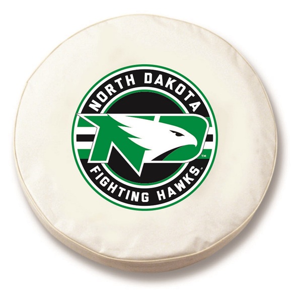 Our North Dakota Fighting Hawks spare tire cover is hand-made in the USA by Holland Bar Stool Company. A state of the art printing process utilizing UV resistant inks ensures that the Fighting Hawks logo is more detailed and durable to withstand direct sun light and look great year after year. The commercial grade, marine vinyl holds up in even the harshest weather conditions. Each North Dakota cover is made to order to fit tires up to 37" for an exact fit. This product is officially licensed and made 100% in the USA. If you need an exact fit wheel cover to protect your spare tire, slap one of these high quality vinyl "Fighting Hawks" tire covers on your vehicle or camper from Team Sports Covers!