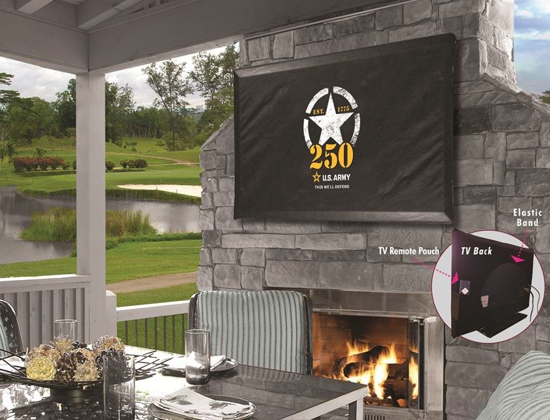 Our United States Army Military outdoor TV cover is designed to protect your television from moisture and the exterior elements. These United States Army outdoor TV covers are officially licensed and are available in 4 standard sizes that will fit televisions 30 to 65 inches. This Military outdoor TV cover has a spandex like material on the back side allowing heat to escape and eliminate overheating. The back of the TV cover has an opening for wrapping around any wall mounting bracket. The United States Army outside TV cover has an elastic bungee cord on the back that will keep the cover from blowing off during inclement weather conditions. Our outdoor television cover includes a pocket on the back side for storing your remote control. These United States Army TV covers are hand made in the USA using a heavy duty commercial grade vinyl material. The "Military" logo is applied utilizing UV resistant inks that will ensure a sharp, crisp image for years to come.