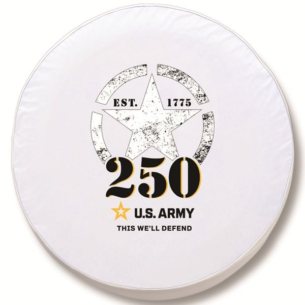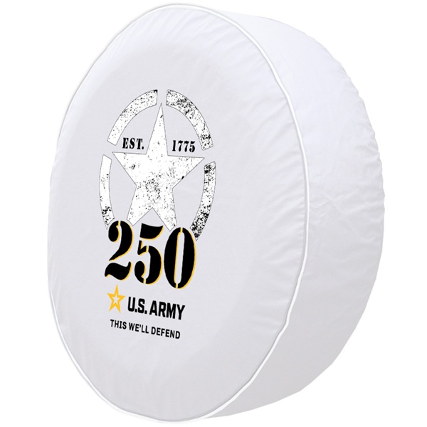 Our United States Army spare tire cover is hand-made in the USA by Holland Bar Stool Company. A state of the art printing process utilizing UV resistant inks ensures that the US Army logo is more detailed and durable to withstand direct sun light and look great year after year. The commercial grade, marine vinyl holds up in even the harshest weather conditions. Each Army cover is made to order to fit tires up to 37" for an exact fit. This product is officially licensed and made 100% in the USA. If you need an exact fit wheel cover to protect your spare tire, slap one of these high quality vinyl "Army" tire covers on your vehicle or camper from Team Sports Covers!
